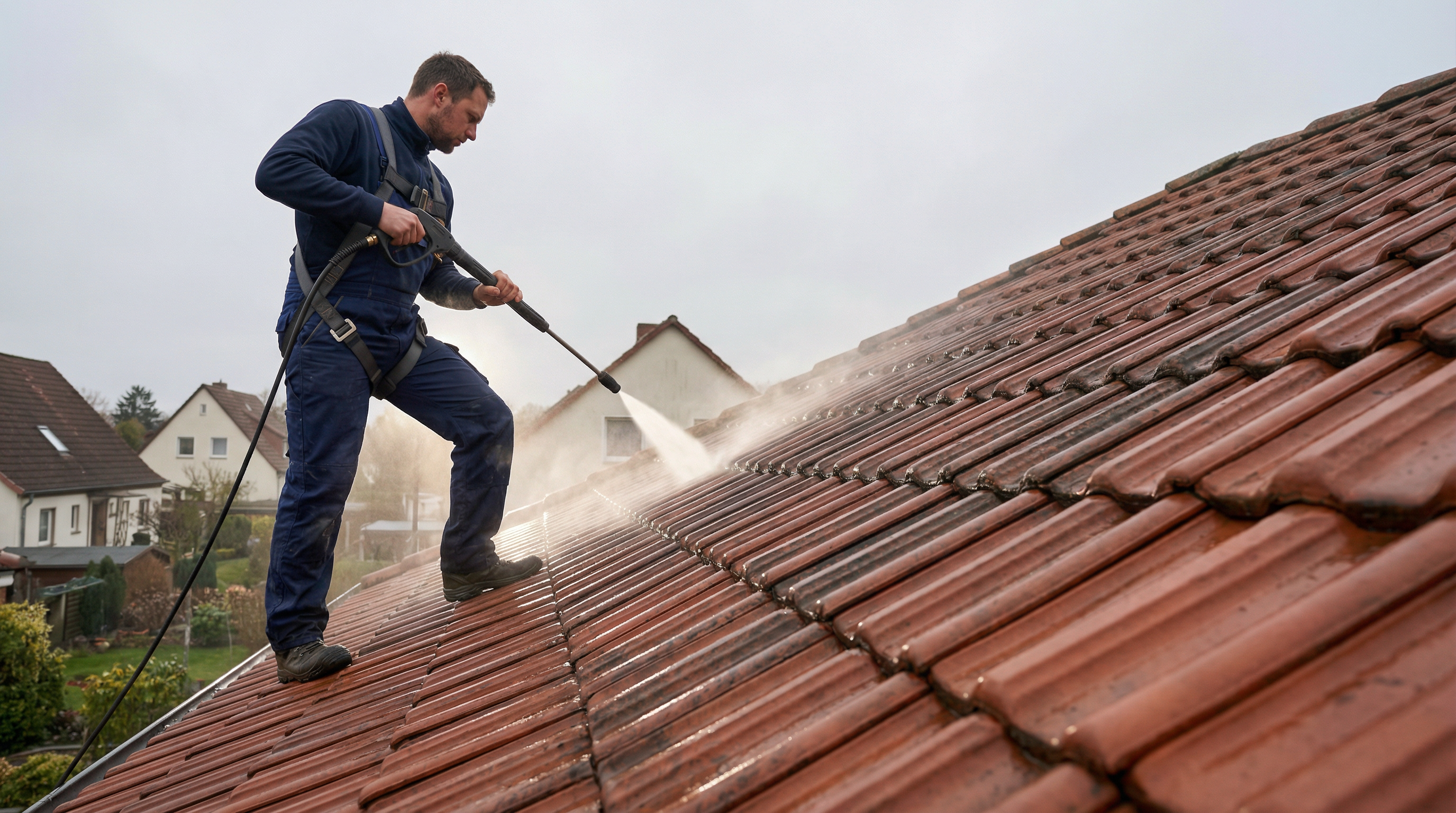 Professionelle Hochdruckreinigung entfernt Moos, Algen, Flechten und jahrelangen Schmutz schonend von Ihren Dachziegeln.